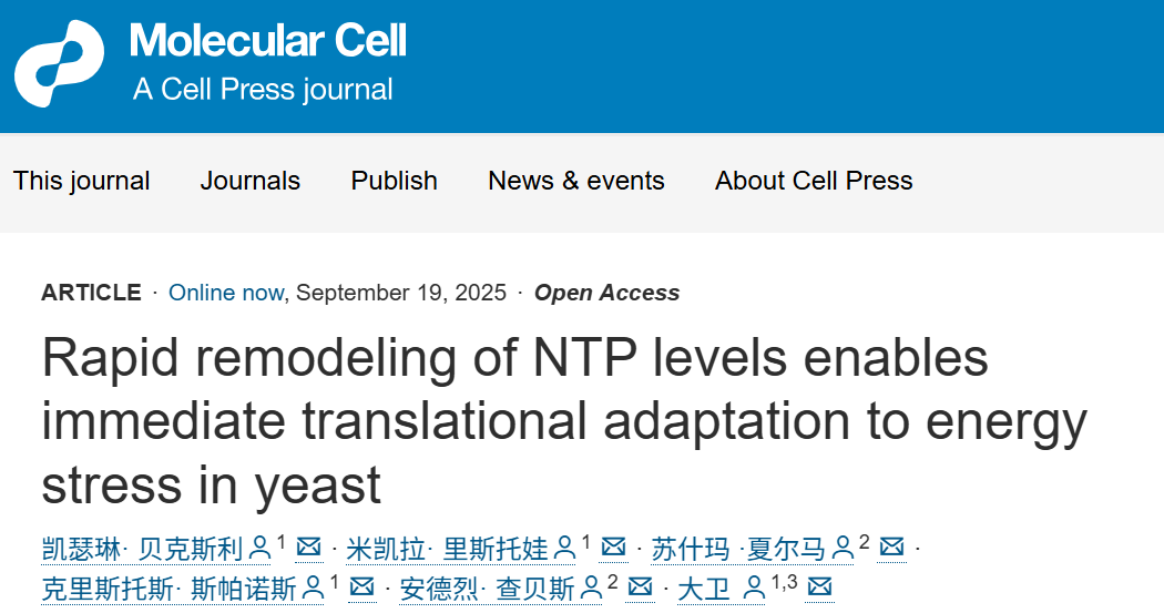 在细胞能量代谢研究领域,如何在能量骤降的条件下保持生命活动的稳定性一直是核心科学问题。近日,研究人员在模式生物 酿酒酵母(Saccharomyces cerevisiae) 中发现了一种全新的 代谢-翻译耦合调控机制,揭示了细胞如何通过核苷三磷酸(NTP)水平的快速重塑,在极短时间内实现翻译反应的适应性调整。