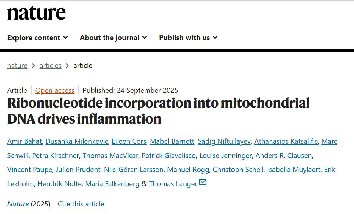 近期,发表在 Nature 的最新研究《Ribonucleotide incorporation into mitochondrial DNA drives inflammation》揭示了核苷酸代谢失衡与炎症反应之间的重要分子机制。研究团队发现,核糖核苷酸(rNTPs)异常掺入线粒体 DNA(mtDNA)会触发 DNA 损伤和外泄,从而激活 cGAS–STING 先天免疫通路,推动炎症及衰老相关表型的发生。这一发现不仅深化了对 代谢-免疫-衰老交叉通路的理解,也为核苷酸代谢调控相关疾病的干预提供了潜在思路。