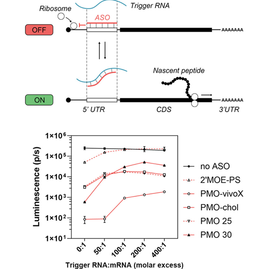 同时设计一个与 ASO 更强互补或竞争性的 trigRNA。当 trigRNA 存在时,它会与 ASO 结合(或置换 ASO–mRNA 结构),从而解除 ASO 对 mRNA 的抑制,使 mRNA 恢复被翻译(“ON” 状态)。