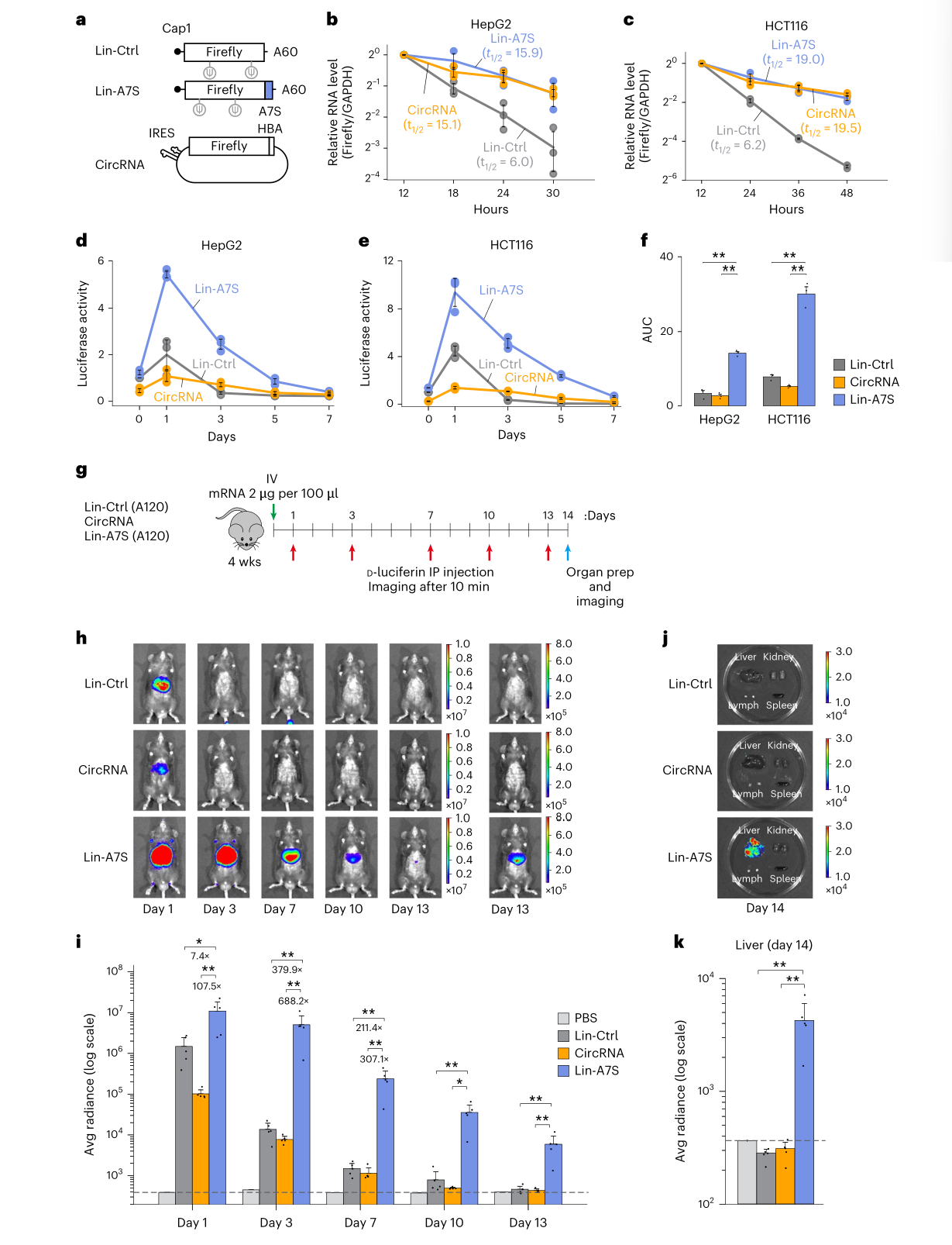 研究团队将A7插入线性mRNA中,并与优化后的环状RNA进行对比: