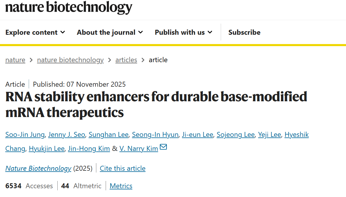 为此,韩国首尔大学V. Narry Kim团队开展了一项系统性研究,从近20万个病毒序列中筛选出能显著增强mRNA稳定性与翻译效率的RNA稳定性增强子,并揭示其通过TENT4介导的混合尾巴延伸机制实现长效表达。该研究发表于 Nature Biotechnology,题为《RNA stability enhancers for durable base-modified mRNA therapeutics》。