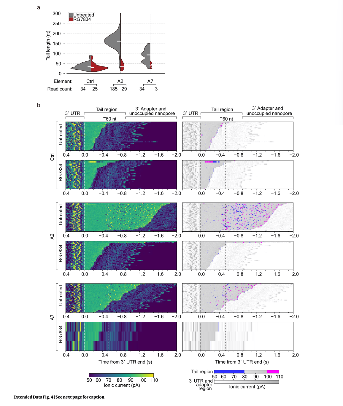 而A7虽无CNGG模体,同样依赖TENT4,提示其可能通过新型适配蛋白发挥作用。纳米孔直接RNA测序进一步证实,A7与A2等元件能显著延长poly(A)尾巴,并在TENT4抑制剂处理后失效。
