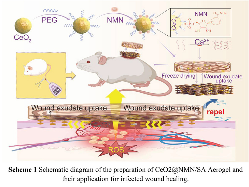 SA 气凝胶基质(海藻酸钠):这种天然多糖形成的三维多孔网络结构,不仅为 CeO₂ 和 NMN 提供了理想的载体,还具备优异的吸水性、生物相容性和可降解性,能为伤口创造一个湿润、透气的微环境,并随着伤口愈合而逐渐降解,避免二次伤害。