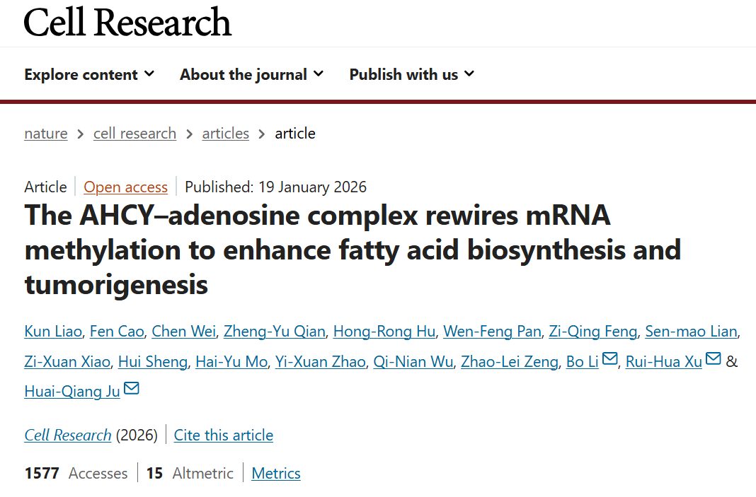 肿瘤代谢与表观遗传交叉领域取得重大突破性进展!中山大学肿瘤防治中心与南方医科大学联合研究团队在国际权威期刊Cell Research发表最新研究成果,首次揭示了甲硫氨酸代谢关键酶AHCY(S-腺苷同型半胱氨酸水解酶)通过与其代谢物腺苷形成复合物,以一种不依赖于传统甲基供体SAM的全新机制调控mRNA m6A甲基化,进而驱动脂肪酸合成与肿瘤发生的完整信号轴。这一发现不仅改写了我们对代谢-表观遗传互作的传统认知,更为肿瘤诊疗提供了全新的生物标志物和治疗靶点。