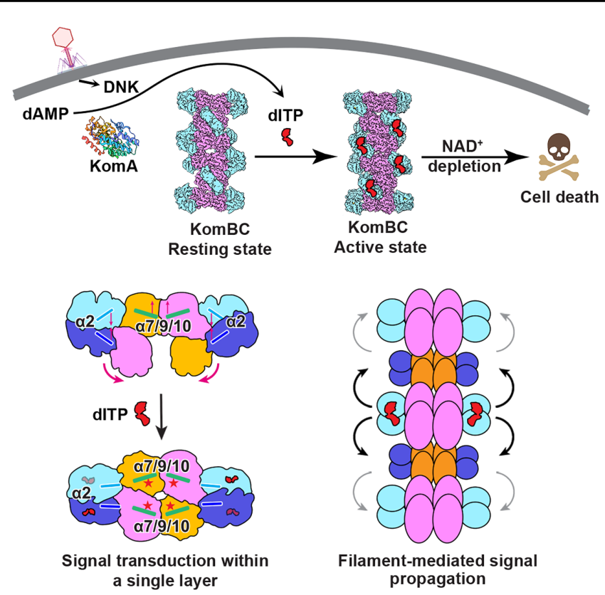 传统细菌免疫系统(如CBASS和Thoeris)通常在信号分子结合后才组装成活性结构。而Kongming系统采用了截然不同的策略:KomBC预先形成丝状聚合物,像天线一样等待dITP信号。冷冻电镜结构显示,这些丝状体由重复的八聚体单元构成,每个单元包含四个KomB和四个KomC分子,排列成C2对称的开放构象。