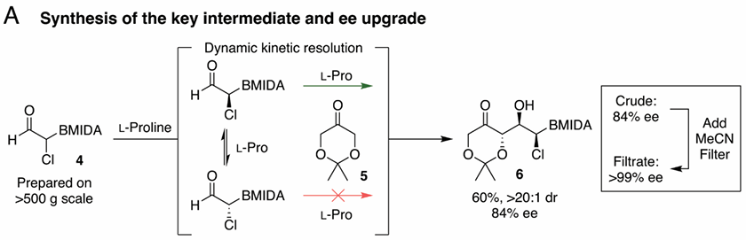 合成路线以脯氨酸催化 α- 氯代硼基醛 4 与二氧环己酮 5 的羟醛反应为起点,以良好收率与优异非对映选择性得到硼化氯代醇 6(图 2.2A)。该反应通过动态动力学拆分进行,优势过渡态选择性生成主非对映异构体;产物 6 的外消旋体可通过简单过滤去除,最终获得 “>99% ee” 的高光学纯中间体。