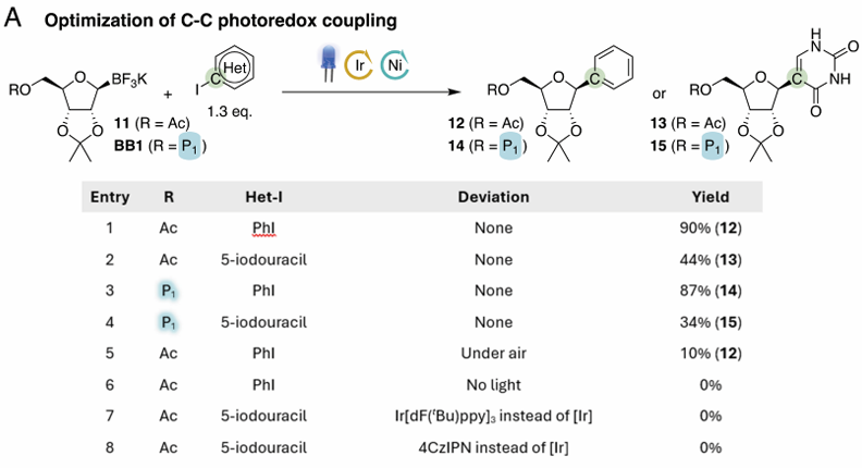 获得砌块 BB1–BB9 后,研究聚焦于光氧化还原偶联这一关键步骤,实现砌块向目标核苷类似物的转化。C-C 偶联条件优化表明:芳基碘化物为最优偶联底物,严格除氧的 1,4 - 二氧六环为最佳溶剂;在所筛光催化剂中,Ir [dF (CF3) ppy] 2 (dtbbpy) PF6 催化效率最优,以 5 - 碘尿嘧啶为底物合成保护型假尿苷衍生物 13,收率达 44%(图 2.3A)。