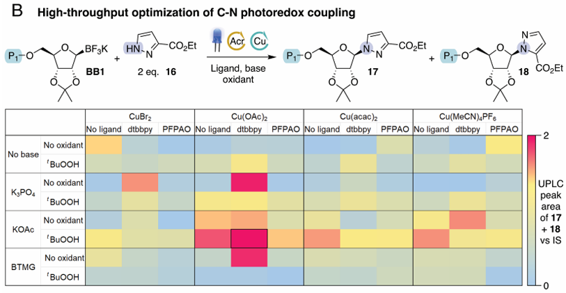 针对 C-N 偶联反应,经 11 种催化剂高通量筛选,确定吖啶鎓有机光氧化还原催化剂为最优选择;并进一步筛选出醋酸铜为铜源、4,4'- 二叔丁基 - 2,2'- 联吡啶为配体,辅以醋酸钾与叔丁基过氧化氢,显著提升反应效率,以总收率 68% 得到保护型 N - 连接核苷类似物 17 与 18(图 2.3B)。