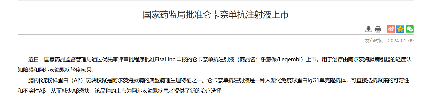 仑卡奈单抗注射液用于治疗阿尔茨海默病