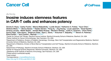 Cancer Cell:肌苷诱导 CAR-T 细胞的干性特征并增强其效力